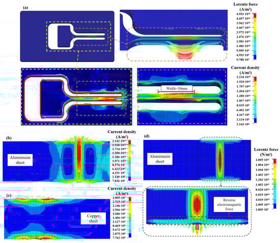 Simulation results under the baseline coil design at 5μs: (a) discharge current density and Lorentz force distribution within the coil; (b) current density distribution within the Al sheet; (c) current density distribution within the copper sheet; (d) Lorentz force distribution within the Al sheet.