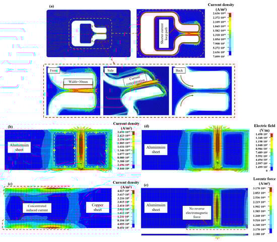 Simulation results under the optimal coil design at 5 μs: (a) discharge current density and Lorentz force distribution within the coil; (b) current density distribution within the Al sheet; (c) current density distribution within the copper sheet; (d) Electric field distribution within the Al sheet; (e) Lorentz force distribution within the Al sheet.