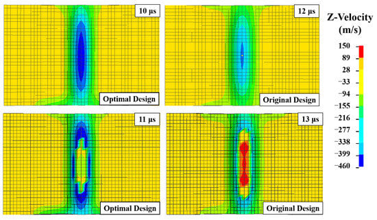 Figure 12 presents a comparison of the cloud view of the collision velocity distribution in the welded region of the aluminum plate, both before and after the optimization process. As a consequence of the optimized coil structure that increases the induced current and Lorentz force in the aluminum sheet, the collision time of the plate was advanced to 10 μs. Furthermore, the collision velocity at the center point of the welding area has also been significantly enhanced. Following a collision in the central region, the new collision points in the optimized design exhibit a high collision velocity as the collision point expands to both sides of the weld region. In contrast, the original design demonstrates a lower collision velocity in comparison to the initial collision velocity. It is worth mentioning that at this moment in the original design, a reverse rebound velocity was also present at the center of the aluminum plate.