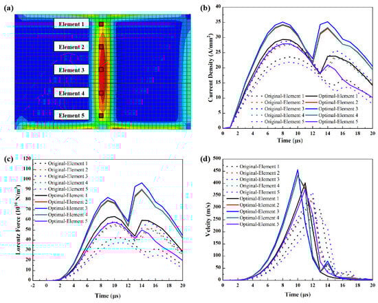 Figure 13 presents a comparison of the curves of current density, Lorentz force, and velocity as a function of time for different elements distributed along the longitudinal direction in the central region of the aluminum sheet in the original design and the optimized design. As illustrated in the figure, the optimally designed coil structure has the effect of enhancing all current density, the electromagnetic force, and the velocity at each element in the welding central region of the aluminum sheet.