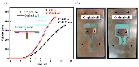 (2) In comparison to the baseline design, numerical results show that the optimized coil structure appeared to have a 25.72% increase in the peak-induced current of the flyer plate and a 58.10% increase in the maximum Lorentz force. According to the PDV measurement, the optimized coil was observed to increase the collision velocity of the flyer plate from 359.92 m/s to 458.93 m/s;