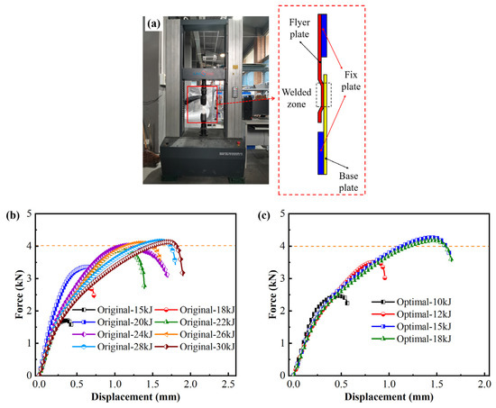 To compare the welding ability of the original and optimal coils, magnetic pulsed welding tests were conducted using AA 1060 metal sheet and T2 Cu metal sheet at various energies with the original and optimal coils. For high reproducibility of experimental data, tests were repeated three times at each energy. As depicted in Figure 15a, the LANSANS tensile tester was used for mechanical tests on welded joints with a loading speed of 2 mm/min. To minimize torque influence in the test, 2.4 mm thickness plates were attached to the clamping parts of the specimens. The mechanical results of joints welded by the original and optimal coils under different discharge energies are shown in Figure 15b,c, respectively. With the increasing discharge energy, the joint’s load-bearing capacity and the deformation displacement also showed an upward trend. Once the maximum tensile load surpasses the strength of the aluminum plate, the tensile load of the joint ceases to grow any further as the discharge energy keeps rising.