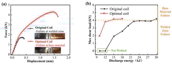 Mechanical experiment results for original and optimized coils: (a) tensile force–displacement performance of the joints at 15 kJ; (b) Weldability test results under different energy.