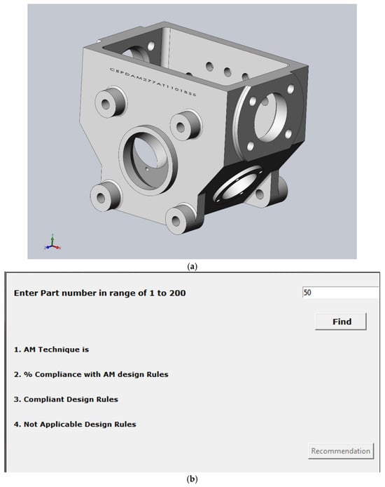 Part number 1 was evaluated by using the DfAM framework. Figure 10a represents the CAD design of the part and was related to the SLS technique. The J48 classifier decision tree algorithm suggested that all the compliance design rules were satisfied within the 100% range. Table 8 illustrates the datasheet for part number 1. Out of all the seven design features considered, only five of them applied to this part, and all those design rules met the recommended features’ minimum threshold constraint values. Thus, no recommendations were suggested by the design rule engine for part number 1. Figure 10b illustrates the design rule engine window for part number 1.