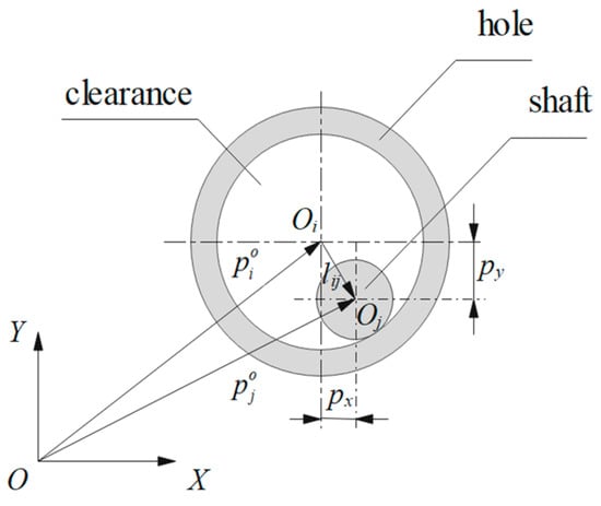 In Figure 1, is the center of the hole, is the center of the axis, the coordinate system XOY is the base coordinate system of the industrial robot, and are the position vectors of the center of the hole and the axis in the base coordinate system, respectively, and are the relative offsets of the center of the articulated axis hole in the directions of the x and y axes, respectively. Define the clearance vector of the joint axis hole offset as the vectorial difference between and .