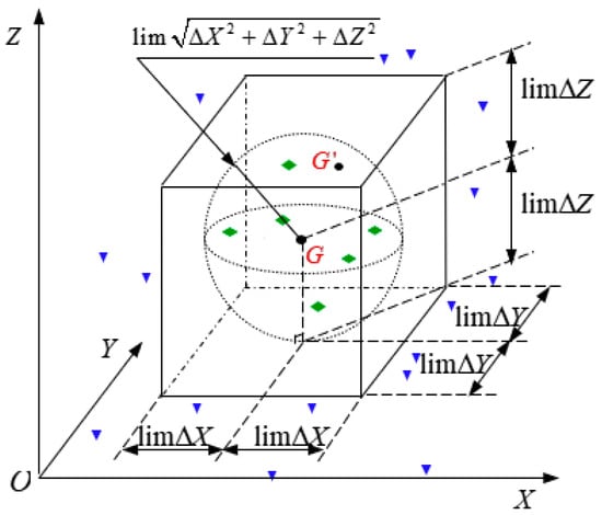 Set , , , and to be the error values of and in the distance direction and in the , , three-coordinate direction, respectively, and and , , be their license values, respectively. The dashed spherical surface is drawn with as the center and as the radius, and the six faces of the solid rectangular body are drawn with as the center and , , as the offset, respectively. The resulting spherical and rectangular surfaces are the failure surfaces for the robot’s positioning accuracy in the distance and , , coordinate directions. Using them as critical surfaces, the robot end position can be divided into two states: reliable and failed. For example, the points inside the ball (green diamond points in the figure) meet the reliability requirements of the distance direction positioning accuracy, while the points outside the ball (blue inverted triangular points in the figure) are the over-limit points of unreliable positioning accuracy. Similarly, the points inside the rectangular body meet the reliability requirements in the , , coordinate direction, and the points outside the upper and lower faces, left and right faces, and front and back faces of the rectangular body are unreliable for positioning accuracy in the coordinate direction, coordinate direction, and coordinate direction, respectively.
