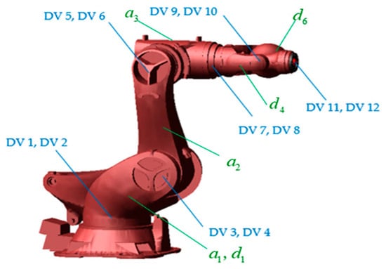 Take the six-joint robot as an example, there are 12 parameterized axes and holes for the six joints, and the radius variables are represented by DV1–DV12, as shown in Figure 5. Similarly, for all the connecting rods in the robot model, the length of the connecting rods and the offset distances are added as the parameterized variables, as shown in Figure 5, with , , , , , the symbols are the same as in the previous figure). The values of all parameterized variables can be set according to the manufacturing process and tolerance requirements of the robot.