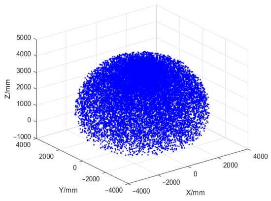 When the joints of a robot perform all possible motions within the rotation range, the set of spatial points reached is called the robot’s workspace. In this paper, based on the Monte Carlo method, the end coordinated information is obtained by randomly taking values for the six joint rotation angles. Theoretically, provided that the number of fetching values is sufficiently large and not repeated, the set of different end coordinates obtained can be regarded as an approximate complete workspace. According to the specific working conditions, the limiting range of the rotation angle of each joint is set, as shown in Table 3, and the value of the joint rotation angle is taken randomly with the help of the RAND function (Equation (29)).