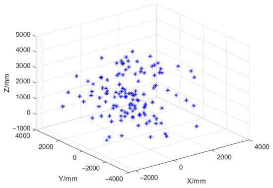 The selection of coordinate point experiment samples has a certain impact on the analysis of robot localization accuracy, too many sample points will affect the computational resources and efficiency, while too concentrated sample points are difficult to establish an accurate error model. Compared with other sampling methods, the optimal Latin hypercube sampling method has an equal probability distribution of sample points, which is more uniform in space, especially suitable for sampling coordinate points in a three-dimensional space. Due to its own sampling priority rules, the demand for the number of samples is less. In this study, the coordinate points in the workspace are sampled by the optimal Latin hypercube sampling method. The number of sampling points is set to 120; the coordinate points of the robot’s workspace after sampling are shown in Figure 8.