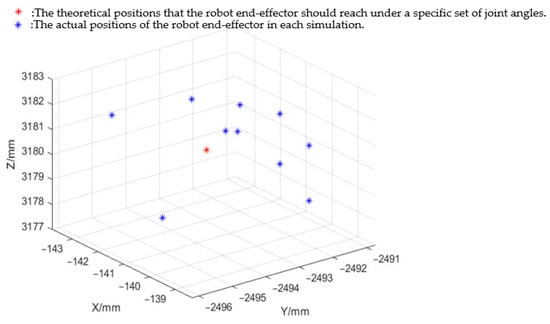 The joint angles corresponding to all sampled spatial coordinate points are calculated according to Equation (28), and the corresponding robot joint angles are input into the ADAMS 2019 model for the simulation. Taking the sampled coordinate points (−141.7851, −2493.118, 3179.973) as an example, the simulation is repeated 10 times, and the joint gap parameters in each simulation are randomly generated from the limit dimensions of the radius variable DV using the Monte Carlo method, to obtain 10 groups of actual spatial coordinate points, as shown in Figure 9. The red coordinate points in the figure are the theoretical positions reached by the robot end execution under this group of joint angles, and the blue coordinate points are the actual positions in each simulation. By analogy, the theoretical spatial coordinate points and actual spatial coordinate points corresponding to the sampled 120 groups of joint angles are derived in ADAMS, and the error range of the 120 groups of spatial coordinate points is obtained according to the maximum and minimum values of the error of each group of coordinate points, which provides data for the subsequent reliability analysis.