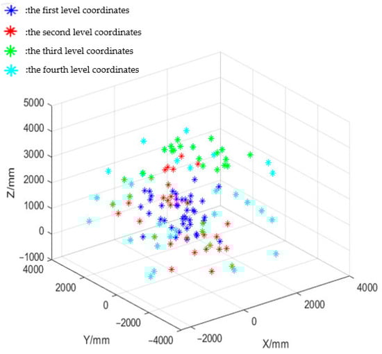 The spatial coordinate points, after stratification in Table 5, are represented by different colors in MATLAB 2019 software, as shown in Figure 10. The blue points represent the first level coordinates, the red points denote the second level, the green points mark the third level, and the lime green points correspond to the fourth level. It can be clearly seen that the blue coordinate points in the first level are concentrated in the locatn area of the center of the robot’s workspace, which is close to the spatial location of the robot’s initial state, indicating that the rotation angle of the joints during operation is not too large, and is minimally affected by the uncertain joint clearance parameters. The spatial positions of the red coordinate points, green coordinate points, and lime green coordinate points are sequentially outward and gradually close to the edge of the workspace, indicating that the positioning precision of the robot’s end-effector is influenced by its position within the workspace, especially under the uncertainty of joint clearance parameters. As the end-effector moves farther from the workspace center, its reliability diminishes.