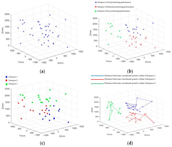 The main points of the two-stage layered hierarchical partitioning method are as follows: First, based on the clustering partitioning optimization model constructed above, KLFCM clustering combined with a genetic algorithm is used to divide all the coordinate points into layers, which are divided into a number of levels, to realize the first stage of layering. Then, the second stage utilizes the same method to carry out re-refined partitioning of the spatial coordinate points in each layer, that is, for the coordinate points of each sub-workspace layer divided in the first stage, respectively, KLFCM clustering combined with a genetic algorithm is used again to carry out the hierarchical re-refined partitioning in the second stage. Relative to the first stage, the values of , , , in the constraints of the second-stage clustering partitioning optimization model should be appropriately reduced according to the specific situation.
