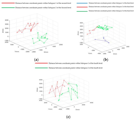 Similarly, the other three levels of spatial coordinate points are partitioned, as shown in Figure 12. The second level is partitioned into two subspaces, the third level is partitioned into three subspaces, and the fourth level is partitioned into two subspaces; the whole robot workspace is partitioned into ten subspaces in total.