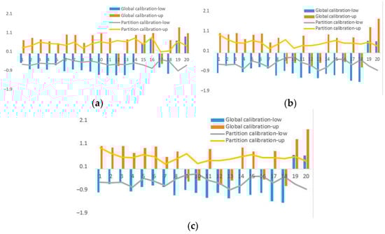 Error intervals in x, y, and z directions for the two cases of zonal calibration compensation and uniform calibration compensation for the whole workspace. (a) Errors in the x-direction; (b) Errors in the y-direction; (c) Errors in the z-direction.