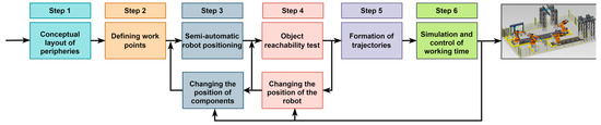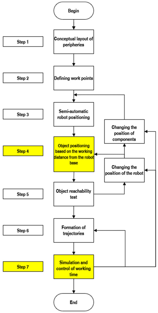 In this study, practical insights into robotic workplace design were summarized into six systematic steps, as shown in Figure 1. These steps form a structured methodology rooted in empirical practices and address key challenges [45] in layout planning and robotic integration.