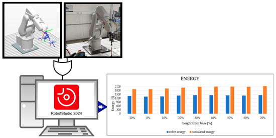 Workflow for comparing energy consumption of a simulated and real ABB IRB 120 robot using ABB RobotStudio 2024.1.1. The chart highlights the impact of robot base positioning on energy efficiency, comparing measured energy values (blue bars) and simulated energy values (orange bars) to analyze discrepancies and trends in energy consumption at varying heights from the robot base.