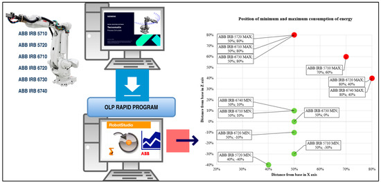 Optimizing the energy consumption of industrial robots is essential for achieving sustainable production and reducing operating costs [61,62,63,64]. This process involves adapting the robot trajectories, improving the work weight placement, and implementing intelligent control algorithms that use advanced simulation tools such as MATLAB R2014b, Simulink R2015a, or ABB RobotStudio 5.61 [65]. These tools allow for a detailed analysis of the impact of the base position, trajectories, and dynamic parameters on the overall robot performance, thus identifying the most efficient configurations.
