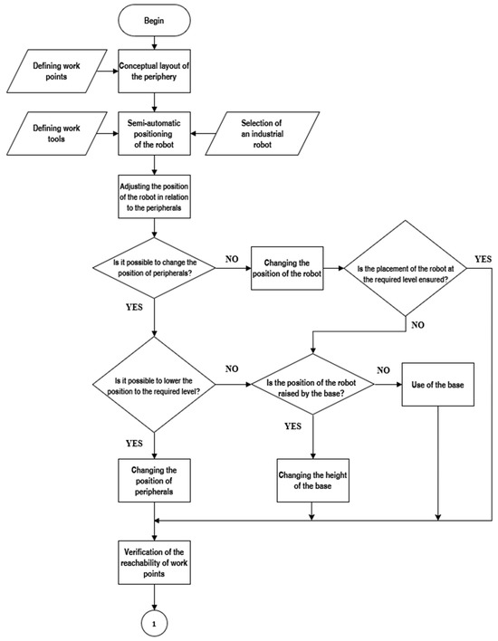 The design of robotic workplaces follows a systematic methodology rooted in empirical knowledge gained through industrial practice. This approach addresses key challenges, such as effective layout design, efficient investment utilization, the optimized use of robots, and cycle time reduction. It builds on decades of experience from companies, supported by multiple studies [41,42,43,44], and integrates these insights into a universal framework.