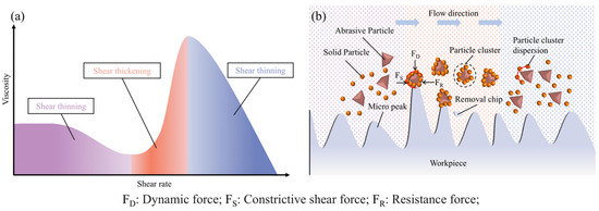 During the STP polishing process, Figure 1a illustrates the relationship between slurry viscosity and shear rate, while Figure 1b depicts the particle state and working mechanism within the slurry at varying shear rates. Under low shear stress conditions, abrasive and solid particles in the STP slurry are uniformly dispersed within the phase. Due to the relatively small dynamic force (FD) on the abrasive, effective removal of workpiece material is challenging. When shear stress from relative motion surpasses a critical value, the STP slurry enters the shear-thickening region, initiating a shear-thickening effect. This effect causes the originally dispersed solid particles in the slurry to form numerous particle clusters via polymerization, significantly enhancing the force on abrasive particles, creating a constrictive shear (FS) force that enables effective micro-cutting on the workpiece’s micro-peaks [24]. As the shear-thickening effect intensifies, the FS surpasses the resistance (FR) from the micro-peaks, shearing off rough peak tops on the workpiece, removing more peaks, and producing larger chips. The FR value depends on the shear area and yield stress of the workpiece material. Upon completion of material removal, the slurry’s shear-thickening effect diminishes as micro-peak shear is eliminated, returning the slurry to its original flow characteristics and dispersing particle clusters. This process demonstrates the dynamic changes in the slurry during STP polishing and elucidates the mechanism for enhancing workpiece surface roughness.