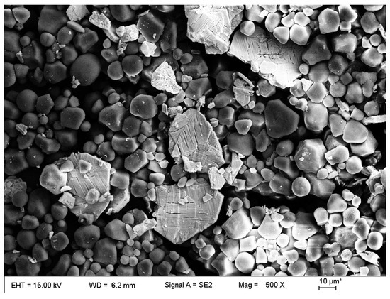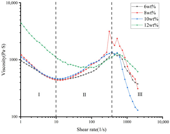 The slurry was made of CeO2 abrasive grains (abrasive particles), polyhydroxy polymer powder (solid particles), and additives mixed with deionized water (dispersed phase). After mixing, the slurry was stirred for 30 min and dispersed with an ultrasonic device for 15 min to make the slurry homogeneous. The microscopic picture of the prepared slurry is shown in Figure 2, where the abrasive particles can be observed to be uniformly distributed in the solid particles of the polyhydroxy polymer powder. The rheological profile of the slurry was measured by a stress-controlled rheometer (MCR 302, Anton Paar, Graz, Austria) at different abrasive concentrations using a 25 mm diameter cone plate with a 2° cone angle and a measurement gap of 0.103 mm, and the results are shown in Figure 3. The rheological profile of the STP slurry has three distinct viscosity zones. In Region I, the low shear rate region exhibits shear thinning. When the shear rate exceeds the specified value of about 10 s−1, the STP slurry undergoes shear-thickening in region II. Shear-thinning behavior was again observed in region III when the shear rate exceeded about 370 s−1. The shear-thickening properties in region II are sufficient for shear-thickening polishing.