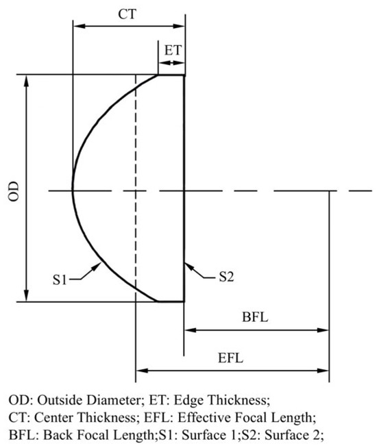 This study focuses on a rotationally symmetric plano-convex aspheric lens as the selected polishing workpiece. The dimensional parameters of the lens are presented in Figure 5: The diameter (OD) is 25 mm, the effective focal length (EFL) is 20 mm, the back focal length (BFL) is 12, the center thickness (CT) is 12 mm, and the edge thickness (ET) is 2.8 mm. The first surface (S1) of the lens is designed as aspherical, while the second surface (S2) is planar. The lens is composed of K51 glass, a commercial material predominantly utilized in the optical field for manufacturing projection lenses, glass dials, touchscreens, levers, and others. The primary components of K51 glass include silicon dioxide (SiO2), with additional additives like soda, lime, and boron to enhance its optical properties. The material properties are detailed in Table 1, with the initial surface roughness measured at 400 nm ± 10 nm.
