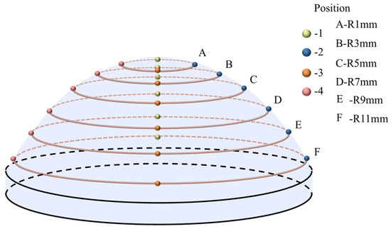 The density of the lens workpiece is 2.53 g/ cm3, the polished area A of the lens workpiece is 7.2355 cm2, (g) is the difference in weight of the lens workpiece before and after polishing, t (min) is the time, and the unit of MRR is nm/min. As shown in Figure 6, the surface roughness Ra was measured on the surface of the workpiece using a Taylor profilometer (Form Talysurf i-Series 1, Taylor Hobson, Leicester, UK), which is a means of contact measurement due to the large curvature of the lens in this study. The Taylor profilometer makes contact with the surface under test by using a very fine diamond stylus which moves up and down in response to the microscopic undulations of the surface. This small change in displacement is captured by the sensor and converted into an electrical signal that automatically calculates the surface roughness parameter Ra through the surface analysis mode provided by the built-in software. Surface roughness Ra was measured at 24 measurement points on the surface of the workpiece, and the average value was calculated three times for each point to ensure the accuracy of the measurement. Concurrently, a super depth-of-field microscope (VHX-7000, Keyence Ltd., Osaka, Japan) was employed to observe the workpiece’s surface topography.