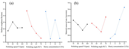 The larger the grey relational grade, the better the corresponding target response, as can be seen in Table 6; the grey relational grades produced by the process parameters of both trials 3 and 9 were significant. Better polishing parameter combinations for the 16 trials were obtained as polishing speed 70 rpm, polishing angle 65°, slurry concentration 12%, polishing speed 90 rpm, polishing angle 55°, and slurry concentration 12%. The mean grey relational grades for each factor level are shown in Table 7. The parameter level corresponding to the largest average grey relational grade corresponds to the best target response. According to Table 7, the optimal levels of polishing speed , polishing angle , and slurry concentration are level 1 (70 rpm), level 4 (70°), and level 4 (12%), respectively, in addition to the range of average grey relational grade of each processing parameter as shown in the table, and the effects of the three parameters on the two target responses, in descending order, are as follows: slurry concentration > polishing angle > polishing speed .