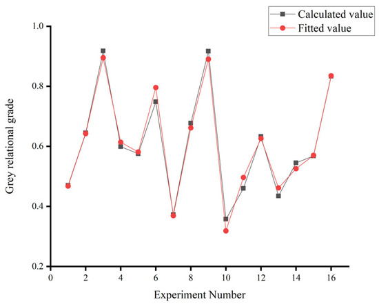 where GRG is the grey relational grade, is the polishing process parameter, and β denotes the quadratic regression coefficient. denotes the linear effect, denotes the interaction effect, and denotes the quadratic effect. The experimental data were regressed using Minitab21 software to establish the prediction model of grey relational grade, as shown in Equation (9). A comparison of the predicted and calculated values of the grey relational grade is shown in Figure 8. As can be seen in Figure 8, the predicted and calculated values of grey relational grades are very close to each other, and the average deviation is 1.66%, indicating that there is no significant difference between the predicted and calculated values.