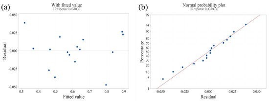 Figure 9 shows the residual plots of the grey relational analysis prediction model; the residuals with the fitted values are shown in Figure 9a, and the distribution of residuals is shown in Figure 9b. All the residuals in the figure are randomly distributed around the value of 0, and no anomalies appear, indicating that the predictive model is a good fit for the observations. Therefore, the regression model based on orthogonal experiments and GRG can be used as a prediction model for grey relational grade.