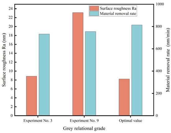 The optimization results are illustrated in Figure 10. The GRG is 1.0488, which corresponds to a combination of process parameters: polishing speed of 70 rpm, polishing angle of 70°, and slurry concentration of 12%, and this result is the same as the result of optimizing the process parameters for the average grey relational grade.