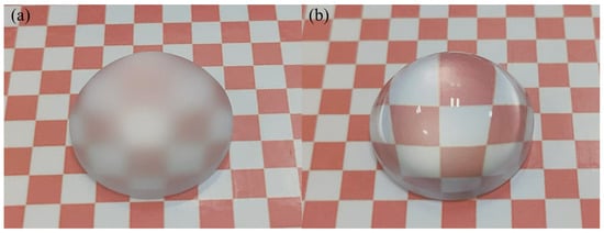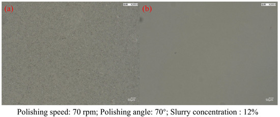 Figure 12 demonstrates the surface morphology observed by the super depth-of-field microscope before and after polishing under the experiment with the optimal process parameters. It can be seen that the previous process of manufacturing the lenses produced a “foggy” surface, and after polishing, the surface is smooth, with no scratches and only a few minor craters. Before and after the polishing process of the workpiece is shown in Figure 13.