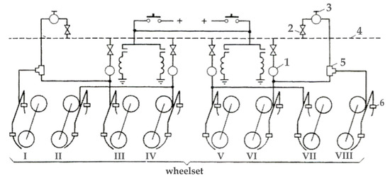 A scheme of the sanding system of an eight-axle locomotive: 1—an electropneumatic valve; 2—a disconnecting valve; 3—a manual sand filling valve; 5—a switching valve; 6—a sandbox nozzle.