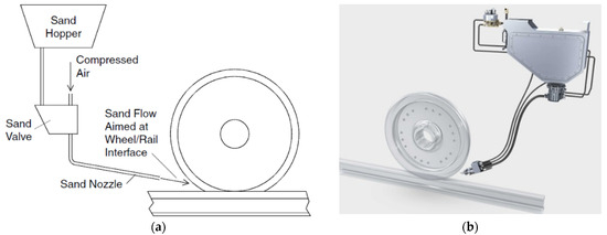 - Skipper, W.A.; Chalisey, A.; Lewis, R. A review of railway sanding system research: Wheel/rail isolation, damage, and particle application. Proc. Inst. Mech. Eng. Pt. F J. Rail Rapid Transit. 2020, 234, 567–583. [Google Scholar] [CrossRef]