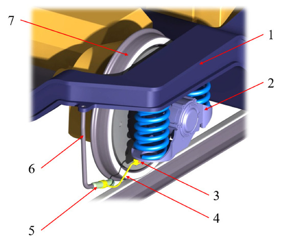 A scheme of the designed sanding system: 1—a bogie frame; 2—an axlebox; 3—a bolt; 4—a bracket; 5—a nozzle; 6—a pipe; 7—a wheelset.