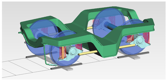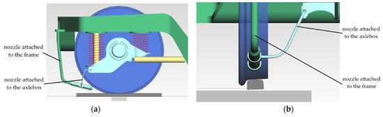 A simulation model of a two-axle bogie of a locomotive (Figure 5) operated on a railway track was created in the Simpack software. It is licensed software for the simulation of multibody systems (MBSs), which allows one to simulate the movement of any mechanical system, including railway transport. Details of the created MBS model of the locomotive bogie with the nozzles are depicted in Figure 6.