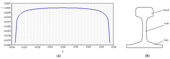 The rail UIC60: (a) a profile in the Simpack software; (b) an illustration of its contours.