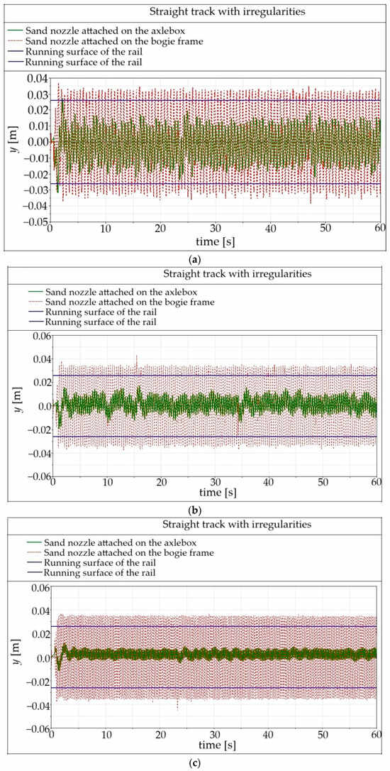 Regarding the quantitative evaluation of the results, the maximal value of the nozzle lateral motion mounted on the axlebox is of 0.027 m for the irregularity amplitude of 0.002 m and for the frequency of 2 rad/s (Figure 12a). However, this value is reached only at the beginning of the bogie motion. For the rest of the motion, the maximal amplitude is up to the value of 0.020 m. It is within the range marked by the running surface of the rail. The minimal value of the nozzle is reached for the design when the nozzle is attached to the axlebox for the frequency of 5 rad/s (Figure 12c). This minimal value is of 0.004 m.