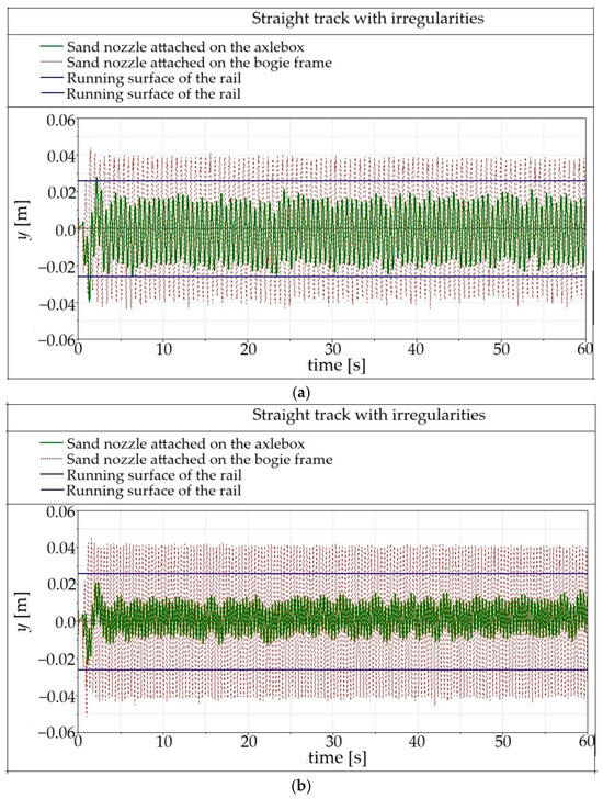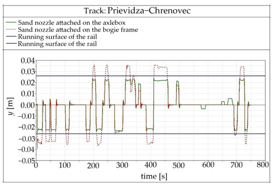 The simulation analyses on the real track section show that the designed improved sanding system has better operational properties than the system, which uses the nozzle mounted on the bogie frame. The nozzle mounted to the axlebox is within the running surface of the rail during the entire track section. The original sanding system with the nozzle attached on the bogie frame has a disadvantage that, on curves, the sand is distributed out of the wanted rail surface. It leads to lower efficiency of the system. The maximal value of the lateral displacement of the nozzle mounted to the axlebox is 0.023 m, while the maximal value of the observed parameter of the nozzle mounted on the bogie frame is over 0.035 m. This is identified for almost all curves excluding four curves in the time interval from 475 s to 680 s.