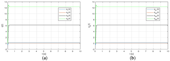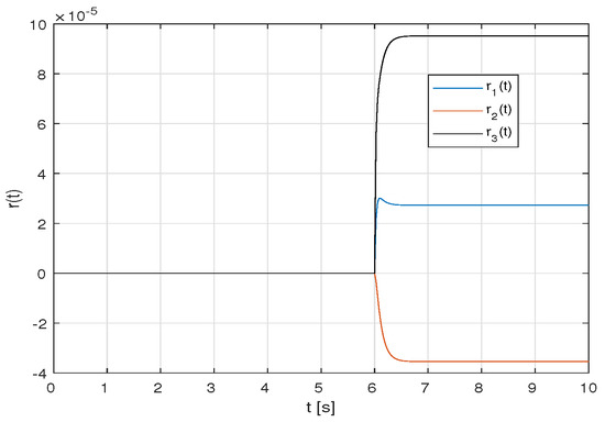 The simulations results are presented in Figure 1 and Figure 2, where Figure 2 shows the evolution of the residual signals generated by the residual disturbance filter in response to a step loss of gain of the second actuator , starting its operation at time . It is clear from Figure 1 that such a small change in gain is practically not reflected in the time expressions of the state variables and their estimated values. The cases of loss of gain of other actuators are manifested analogously.