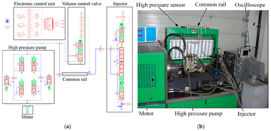Simulation model and test bench of common rail system. (a) Simulation model of the high-pressure common rail system; (b) test bench of the high-pressure common rail system.