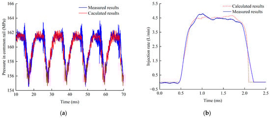 Measured values and calculated values of the common rail system. (a) Comparison between measured and simulated rail pressure value; (b) comparison between measured and simulated fuel injection rate.