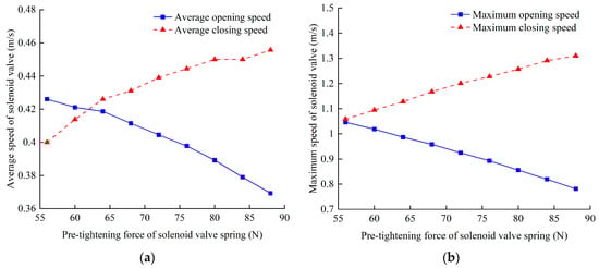 Influence of the pre-tightening force of the solenoid valve spring on speed response characteristics. (a) Influence of the pre-tightening force on average speed of the solenoid valve; (b) influence of the pre-tightening force on maximum speed of the solenoid valve.