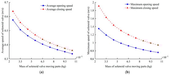 Influence of the mass of the solenoid valve moving parts on speed response characteristics. (a) Influence of the mass of moving parts on average speed of the solenoid valve; (b) influence of the mass of moving parts on maximum speed of the solenoid valve.