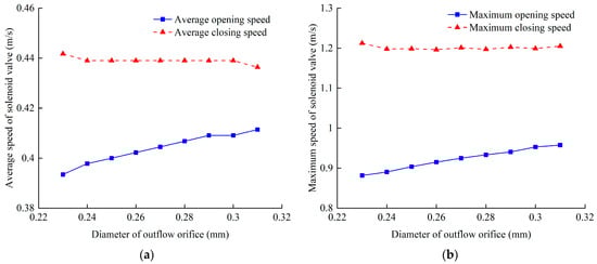 Influence of the diameter of the outflow orifice on speed response characteristics. (a) Influence of the diameter of the outflow orifice on average speed of the solenoid valve; (b) influence of the diameter of the outflow orifice on maximum speed of the solenoid valve.