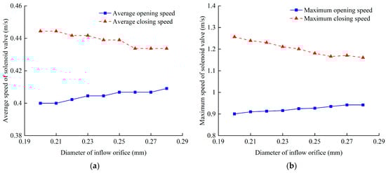 Influence of the diameter of the inflow orifice on speed response characteristics. (a) Influence of diameter of the inflow orifice on average speed of the solenoid valve; (b) influence of diameter of the inflow orifice on maximum speed of the solenoid valve.