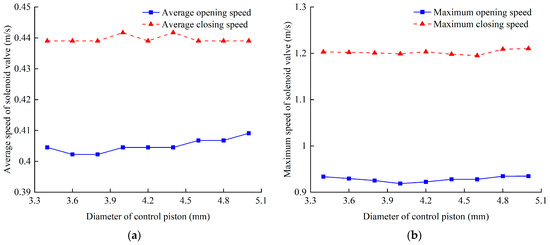 Influence of the diameter of the control piston on speed response characteristics. (a) Influence of the diameter of the control piston on average speed of the solenoid valve; (b) influence of the diameter of the control piston on maximum speed of the solenoid valve.