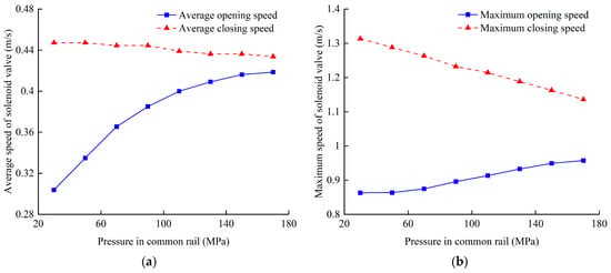 Influence of pressure in the common rail on speed response characteristics. (a) Influence of pressure in the common rail on average speed of the solenoid valve; (b) influence of pressure in the common rail on maximum speed of the solenoid valve.