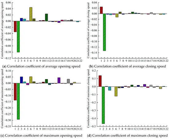 As shown in Figure 10a, the second-order factor 11, derived from the interaction of various influencing parameters, exhibits a correlation coefficient of 0.0234 with the average opening speed of the solenoid valve. This represents the strongest positive correlation among all second-order factors, making it the most significant influencing factor within this category. The correlation coefficients of factors 7, 9, 10, and 16–19 with the average opening speed of the solenoid valve range from 0.0019 to 0.0078, showing a positive correlation. Conversely, factors 13–15 and 21 show negative correlations, with coefficients ranging from −0.0049 to −0.0019. These factors are considered secondary influences among the second-order factors. The absolute values of the correlation coefficients between the other secondary influencing factors formed by the interaction of the parameters and the average opening speed of the solenoid valve are small, and the influences on the average opening speed of the solenoid valve are weak. Similarly, as indicated in Figure 10b–d, factors 7, 8, 10–14, 16–18, 20, and 21 are the primary second-order factors affecting the solenoid valve average closing speed. Factors 9 and 15 serve as secondary factors, whereas second-order factor 19 exerts a minimal influence on the average closing speed. Factors 7, 11, 12, 15, 18, and 19 are the key second-order factors affecting the maximum opening speed of the solenoid valve. Factors 8–10, 13, 14, 16, 17, and 20 serve as minor factors, while second-order factor 21 has an insignificant effect on the maximum opening speed. Factors 7, 8, 11, 13, 15–18, and 20 are the dominant second-order factors influencing the maximum closing speed of the solenoid valve, while the remaining second-order factors have a secondary impact on the maximum closing speed.