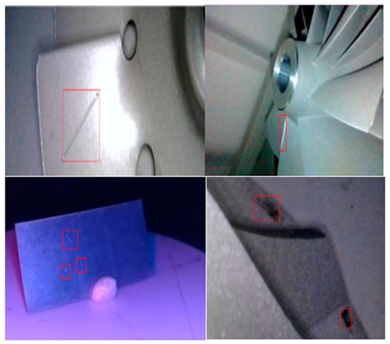 Dataset: For this research, we utilized a specialized dataset from Kaggle specifically designed for detecting and identifying defects in aero-engines (https://www.kaggle.com/discussions/accomplishments/, accessed on 3 December 2024). The dataset consists of high-resolution images of turbine blades from different engine types, each carefully annotated with detailed information about the defects’ location and nature. This structure allows for precise analysis and the application of machine learning algorithms for defect detection and predictive maintenance, ultimately enhancing the reliability and safety of aircraft engines. Figure 1 shows the samples of defects. To address the class imbalance in the dataset, class weights were calculated using the compute class weight function from scikit-learn [74]. These weights were incorporated into the loss function during training to ensure that the model treated all classes equitably, preventing it from favoring the more frequent classes.