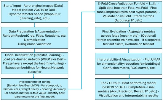 Overview of the proposed pipeline for aero-engine defect detection, illustrating data preparation, model initialization (VGG19 or DeiT), hyperparameter tuning, cross-validation, final evaluation, and interpretability/visualization steps.